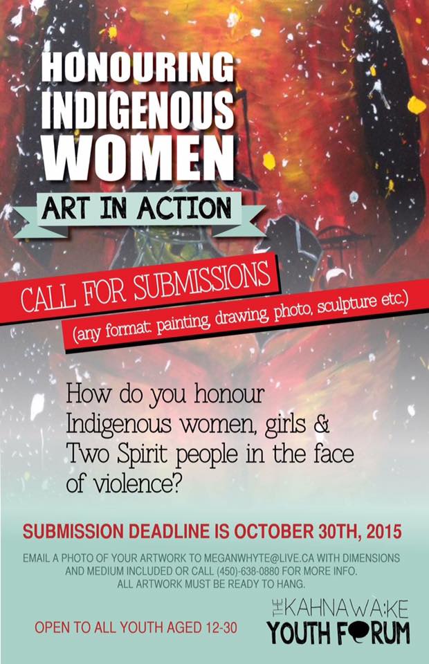 Megan Kanerahtenha:wi Whyte is a young mother, artist, art educator, and art therapist candidate from the Kahnawake Mohawk First Nation community. She is currently completing a MFA at Concordia University in Art Therapy, with focus on addressing multigenerational trauma and attachment through visual media. Outside of her schooling, Megan is actively involved with the Kahnawake Youth Forum, the Native Youth Sexual Health Network and the Indigenous Young Women’s National Advisory Board providing an arts-based approach to social change. Her main project, Skatne Ionkwatehiahrontie, is a youth program that aims to foster relationships to the land, explore sexual health and connect youth to cultural networks. Megan’s social work in these spaces also inspire her artistic development, having her art pieces reflect concepts of healthy relationships, indigenous ‘womanism’, as well as environmental, reproductive, and social justice.